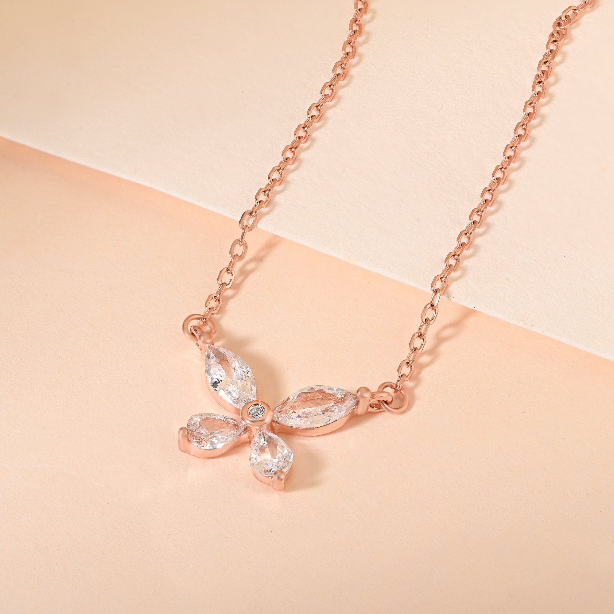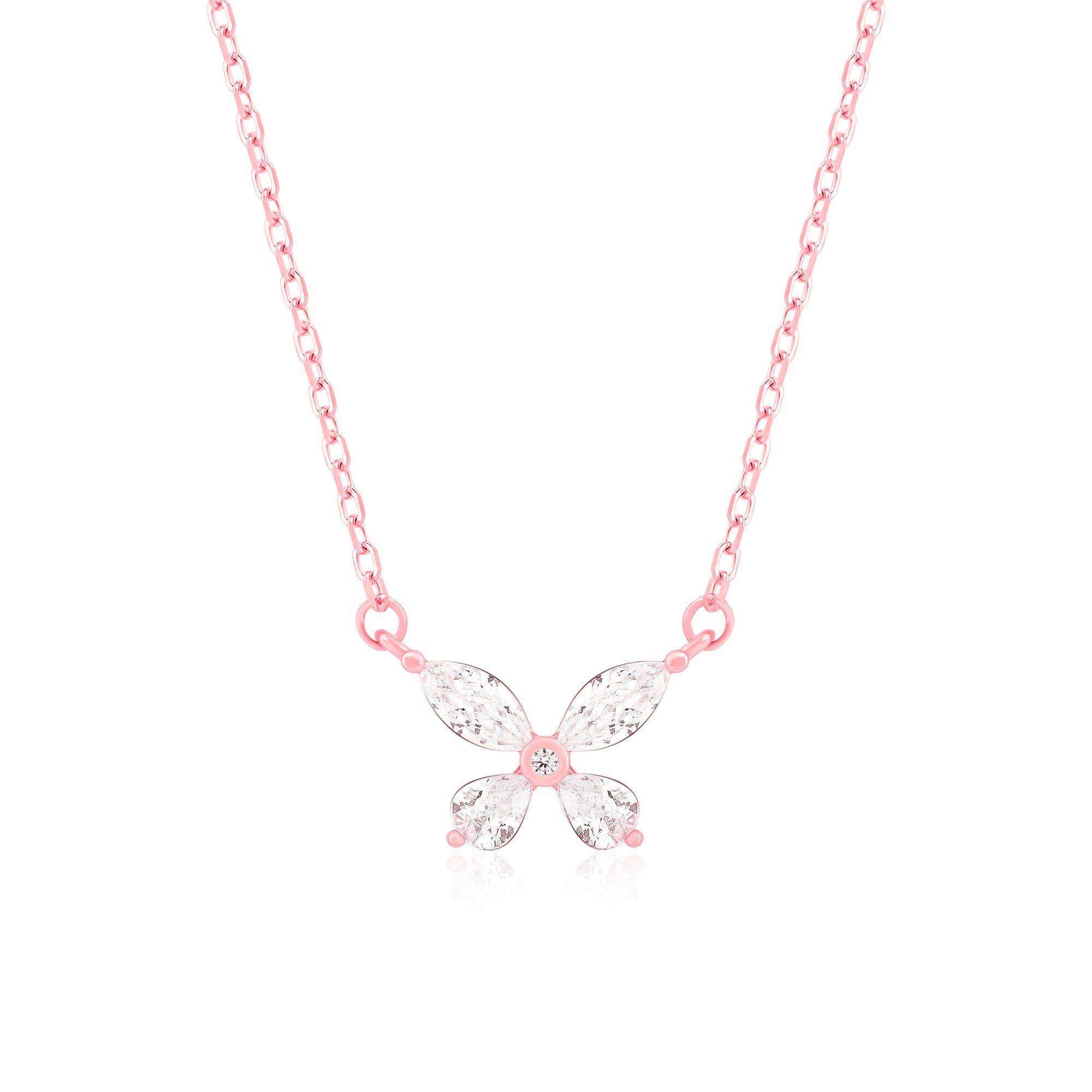 This silver chain design is crafted in pure 925 silver and plated in rose gold for a soft, feminine finish. The pendant features a delicate butterfly motif, each wing adorned with marquise and pear-cut CZ stones, centered with a single round gem. Making it a beautiful choice as a silver locket chain alternative or a statement accessory for layering.